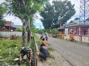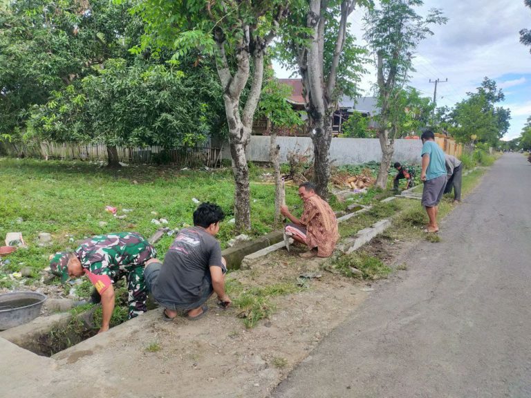 Dengan semangat gotong royong, Serka Sudirman mengajak warga setempat untuk berpartisipasi dalam pembersihan saluran air yang melintasi dusun mereka.