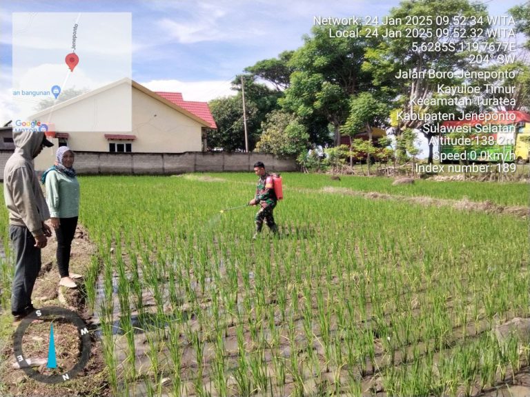 Sertu Syarifin terjun langsung ke sawah membantu para petani dalam kegiatan penyemprotan hama tanaman padi di Lahan milik Bapak Dulimang warga Dusun Ujung Bori, Desa Kayuloe Timur, Kecamatan Turatea, Kabupaten Jeneponto pada Jumat 24/01/25.