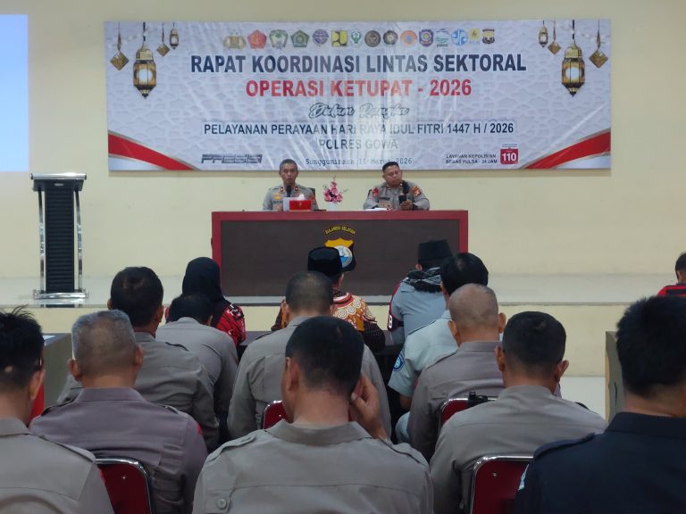 LP HAM RI News, Polres Gowa menggelar Rapat Koordinasi Lintas Sektoral Operasi Ketupat 2026 dalam rangka kesiapan pengamanan dan pelayanan perayaan Hari Raya Idul Fitri 1447 H/2026 M. Kegiatan tersebut berlangsung di Aula Rewako Polres Gowa, Kamis (12/3/2026).