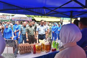 Setelah vicon, Pangdam XIV/Hasanuddin beserta rombongan meninjau langsung pelaksanaan bazar di pelataran Mako Brigif 11/Badik Sakti. Bazar ini melibatkan berbagai UMKM binaan Persit, Bhayangkari, serta masyarakat setempat, yang menawarkan kebutuhan pokok dengan harga lebih terjangkau.