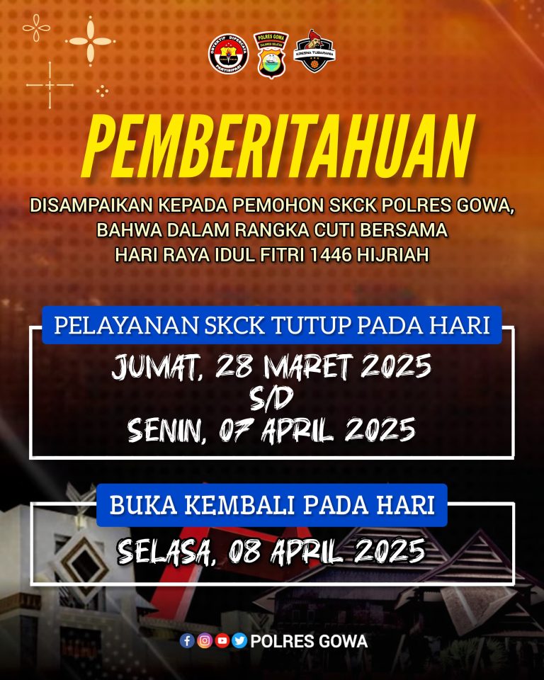 LP HAM RI News, Satuan Intelkam (Satintelkam) Polres Gowa menginformasikan kepada masyarakat, khususnya pemohon Surat Keterangan Catatan Kepolisian (SKCK), bahwa layanan SKCK akan ditutup sementara dalam rangka cuti bersama Hari Raya Idul Fitri 1446 Hijriah. Selasa (25/3/2025).