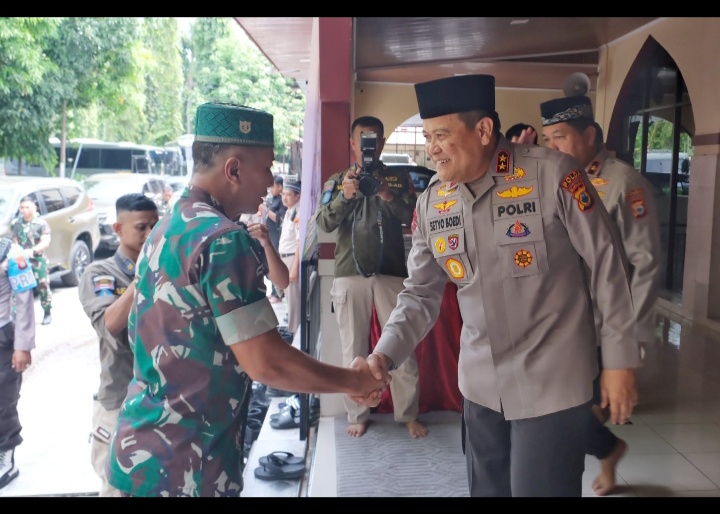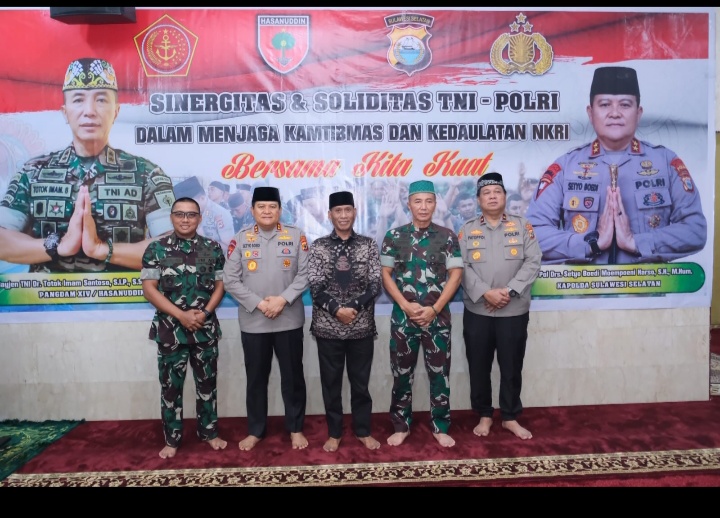 LP HAM RI News, Kapolda Sulsel Irjen. Pol. Drs. Setyo Boedi Moempoeni Harso, S.H., M.Hum dan Wakapolda Sulsel Wakapolda Sulsel, Brigjen. Pol. Chuzaini Patoppoi, S.St.M.K., S.H melaksanakan Sholat Dhuhur berjamaah bersama Pangdam XIV Hasanuddin Mayjen TNI Dr. H. Totok Imam Santoso, S.I.P., S.Sos., M.Tr.(Han) beserta Irdam, para PJU, Perwira dan Bintara serta Tamtama Kodam XIV Hasanuddin di Mesjid Syuhada 45 Mapolda Sulsel, Selasa ( 02/05/2023).