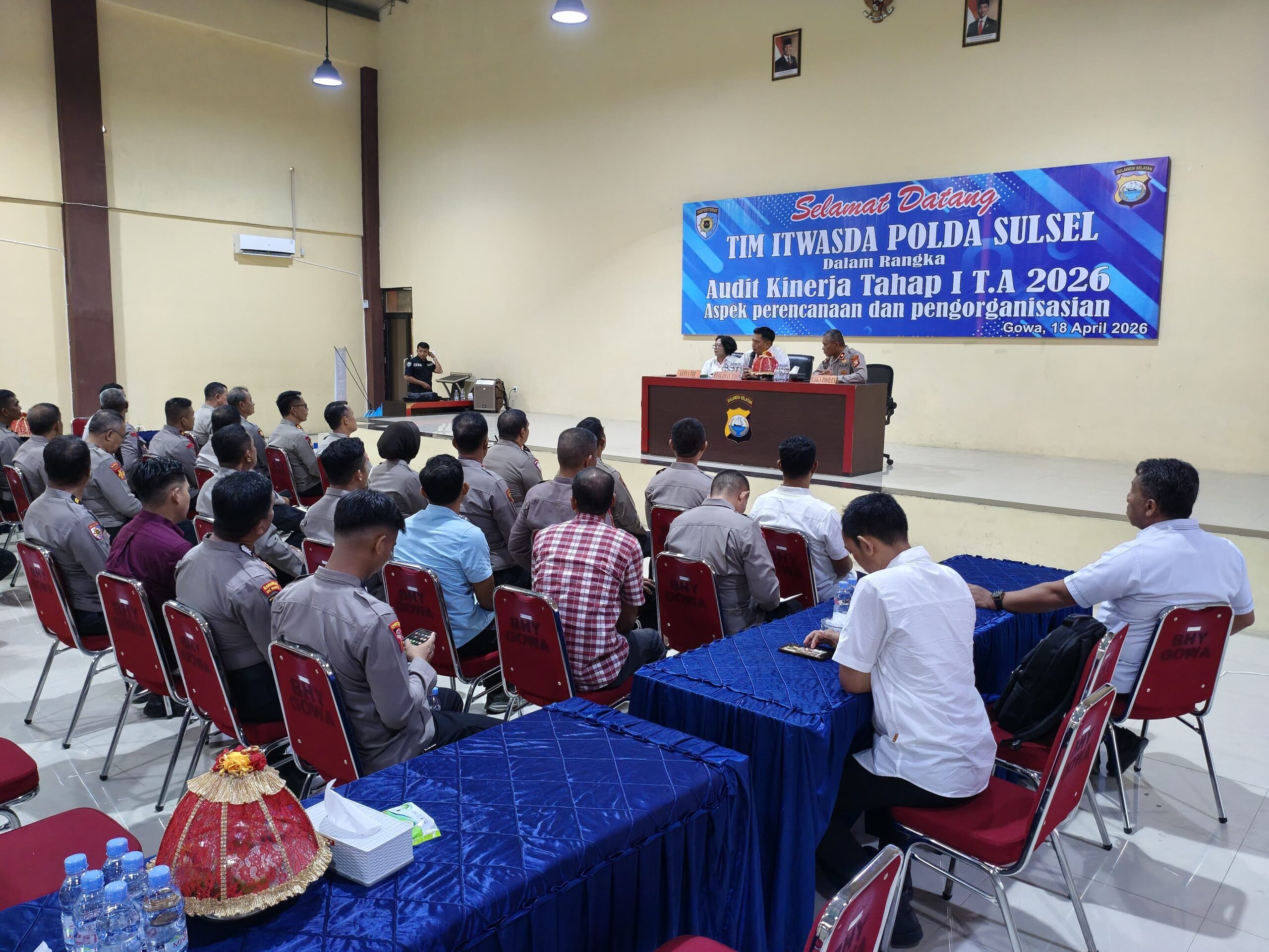 Kegiatan audit tersebut dilaksanakan di Aula Rewako Wicaksana Laghawa Polres Gowa, dan dipimpin langsung oleh Pengawas Tim KOMBES POL. Budi Wahyono, S.H, S.I.K Μ.Η.