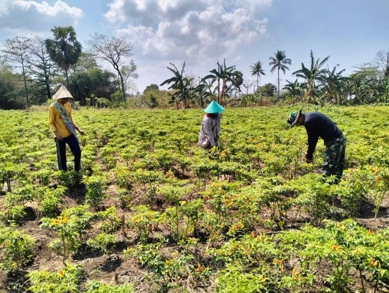 personel Satgas TMMD yang dipimpin oleh Sertu Kamaruddin membantu warga setempat dalam kegiatan panen cabai.