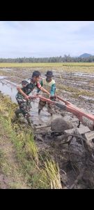 Nampak terlihat Babinsa Koptu Abd. Haris turun langsung ke sawah bersama petani untuk membantu dalam proses penggarapan lahan sawah musim tanam kedua. Keikutsertaan Babinsa ini merupakan bagian dari peran TNI dalam mendukung program ketahanan pangan serta membantu meningkatkan hasil pertanian di wilayah binaannya.
