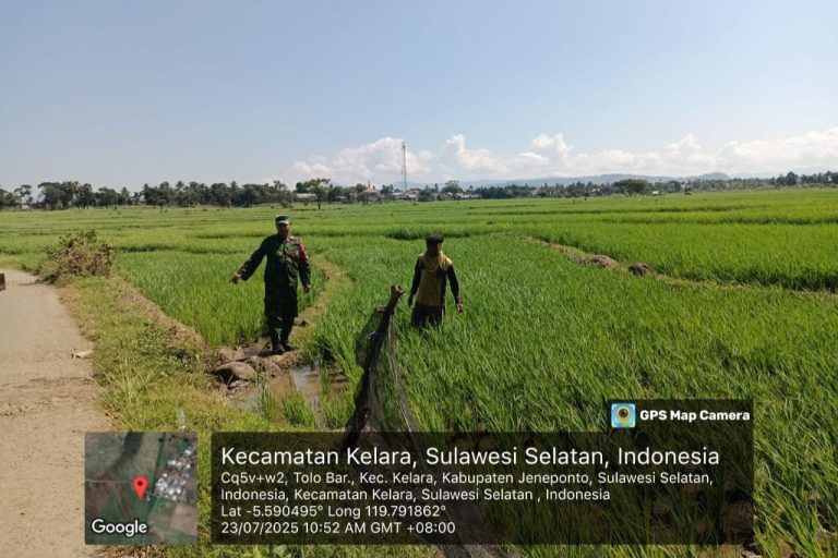 LP HAM RI News, Jeneponto – Di bawah terik matahari siang yang menyengat, Babinsa Koramil 04/Kelara Kodim 1425/Jeneponto, Serka Jamaluddin tetap semangat melaksanakan tugasnya menyambangi petani di lahan persawahan Lingkungan Borongloe, Kelurahan Tolo Barat, Kecamatan Kelara, Kabupaten Jeneponto, Rabu, 23/07/2025.