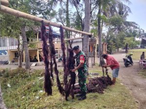 Dengan penuh semangat Babinsa hadir untuk memberikan dukungan dengan membantu petani menjemur rumput laut di pagi hari sebelum waktu berbuka.