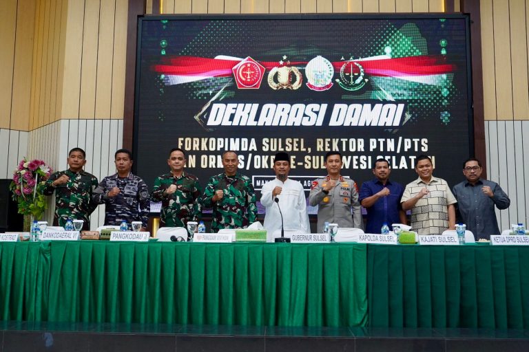 LP HAM RI News, Makassar – Wujudkan Sulsel yang kondusif, Pangdam XIV/Hasanuddin Mayjen TNI Windiyatno bersama unsur Forum Koordinasi Pimpinan Daerah (Forkopimda) Sulawesi Selatan, para Rektor Perguruan Tinggi Negeri (PTN) maupun Swasta (PTS), serta Organisasi Kemasyarakatan (Ormas) dan Organisasi Kemasyarakatan Pemuda (OKP) se-Sulawesi Selatan menggelar Deklarasi Damai, bertempat di Balai Pertemuan Hasanuddin (BPH), Makodam, Jl. Urip Sumoharjo, Kota Makassar, Minggu (31/8/2025).